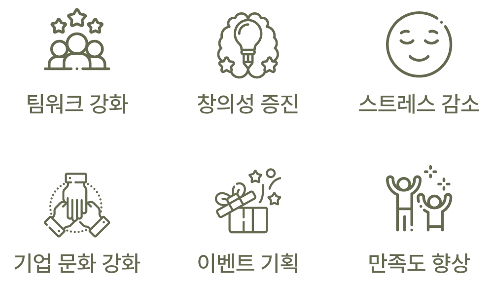 팀워크 강화 / 창의성 증진 / 스트레스 감소 /